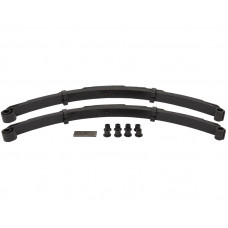 Our front springs feature a full military wrap on the front and the 1/4 wrap on the rear. Spring rate is 220 lbs per inch. Leaf pack is 6 leaves. Springs are 47" long as measured along the top leaf. Pin to center of front mount is 22" and pin to center of the shackle mount is 25". New poly bushings and left side spring pad are included with springs.